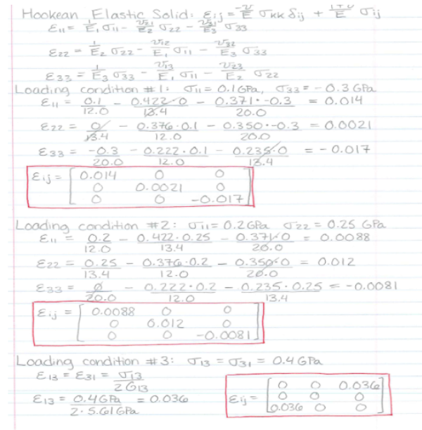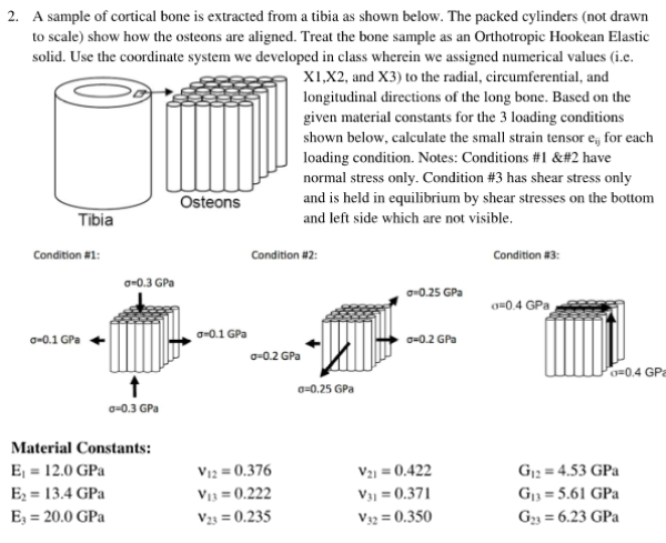 A sample of cortical bone is extracted from a tibia as shown below. The packed cylinders show how the osteons are aligned. Treat the bone sample as an orthotropic hookean elastic solid. Use the coordinate system we developed in class wherein we assigned numerical values the the radial, circumferential, and longitudinal directions of the long bone. Based on the given material constants for the 3 loading conditions shown below, calculate the small strain tensor for each loading condition.