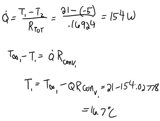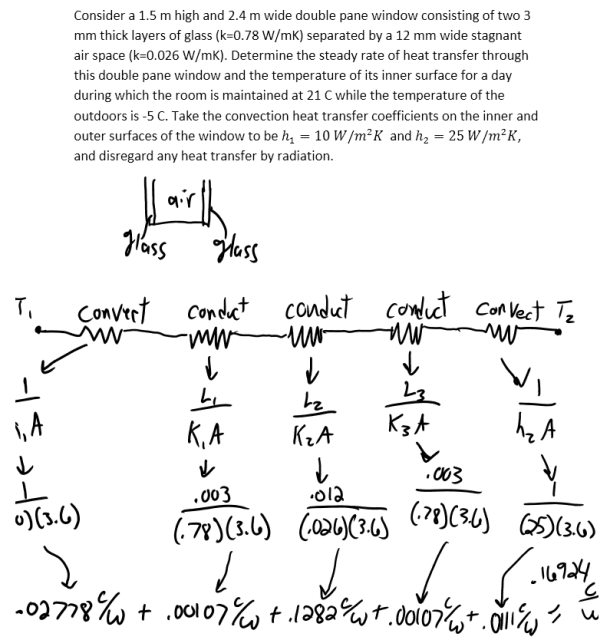 Consider a 1.5 m high and 2.4 m wide double pane window consisting of two 3 mm thick layers of glass (k=0.78 W/mK) separated by a 12 mm wide stagnant air space (k=0.026 W/mK). Determine the steady rate of heat transfer through this double pane window and the temperature of its inner surface for a day during which the room is maintained at 21 C while the temperature of the outdoors is -5 C. Take the convection heat transfer coefficients on the inner and outer surfaces of the window to be h_1=10 W/m^2 K and h_2=25 W/m^2 K, and disregard any heat transfer by radiation.