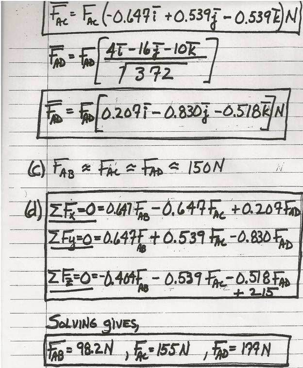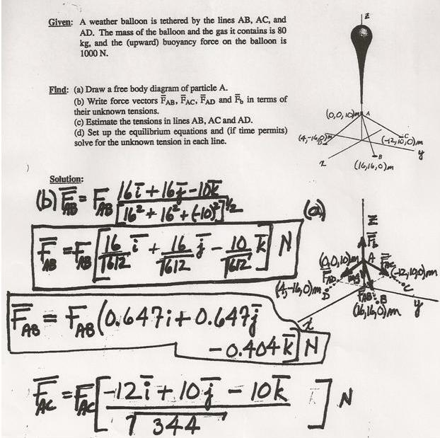Write force vectors in terms of their unknown tensions. Estimate the tensions in lines AB, AC, and AD.